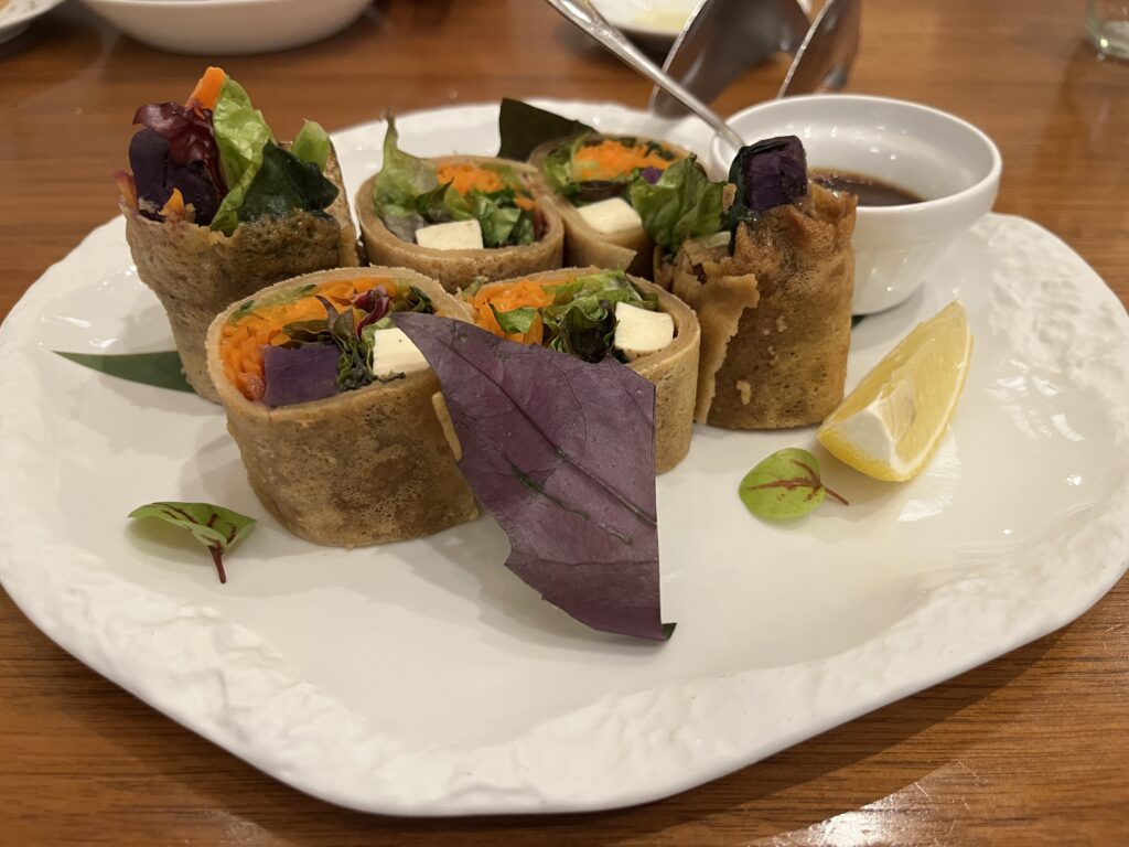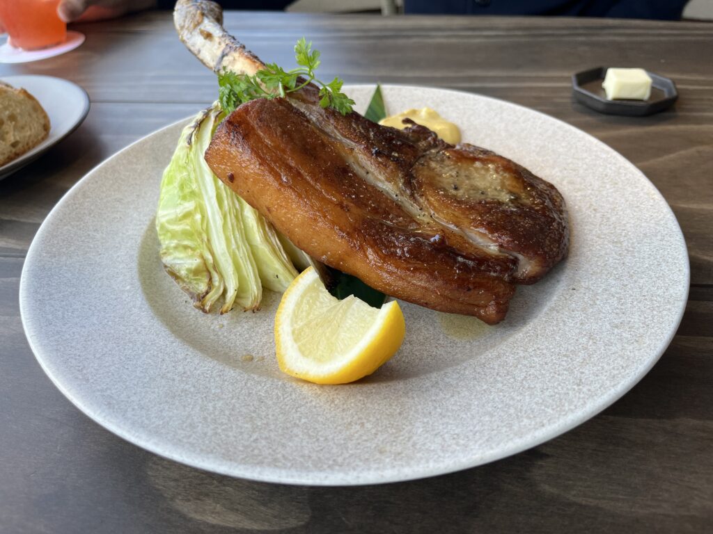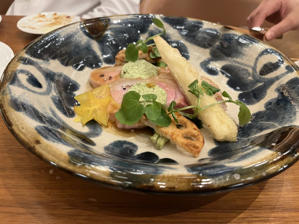 娘はキッズメニューのおうどんを、大人は海ぶどうサラダやポーポーという春巻きみたいな前菜、あぐー豚ロース肉のロティなどいただきました。